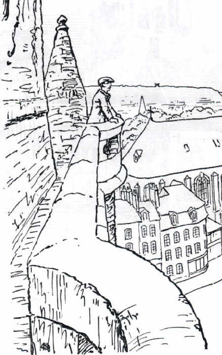 Le dernier guetteur du beffroi a été Théodore Tourniquet. On le voit ici sur la plate-forme, jetant un ultime regard sur la ville de Boulogne-sur-mer en 1922. Le chemin de ronde des guetteurs que l'on apperçoit est aussi celui emprunté par notre ancêtre Jehan de Bremme entre 1670 et 1700. Dessin du Dr. H. Gros. Tiré de Les dossiers de l'histoire boulonnaise, no. 27, 1981, page 4.