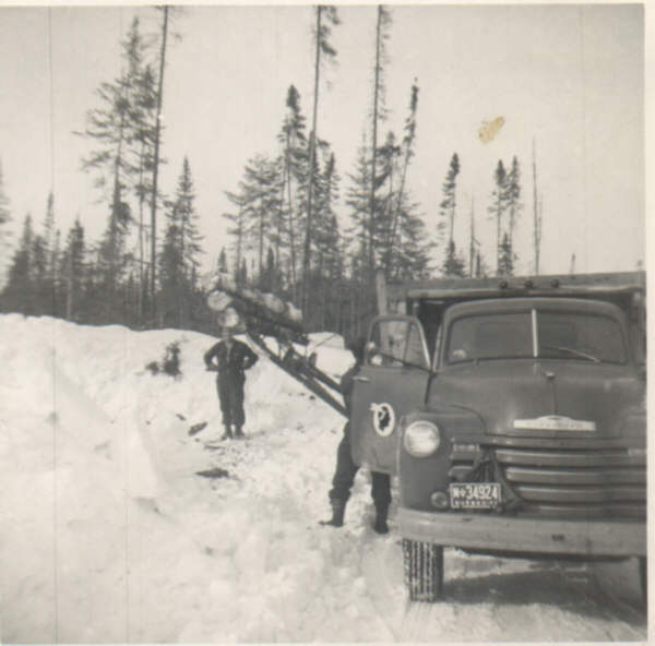Gérard Carrier, camionneur à la baie Carrière en mars 1957. Gérard Carrier est derrière la porte. Camion 1953 "Le sauvage" avec chargeuse à bras. A gauche (les mains sur les hanches) son employé Armand Macameau. Le camion provenait de l'embouleilleur de boissons gazeuses ayant pour nom de commerce Pontiac de Ville-Marie. (photo: collection Denis Carrier)